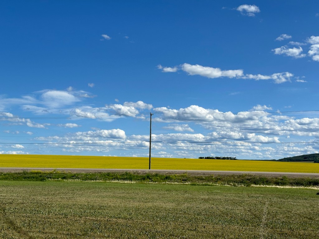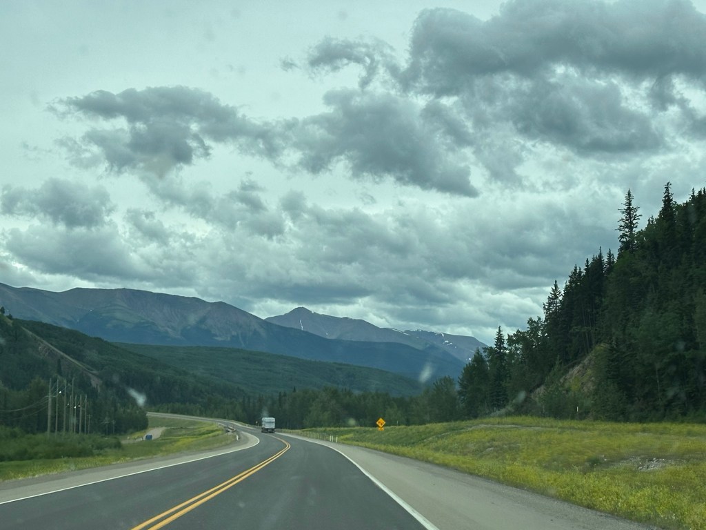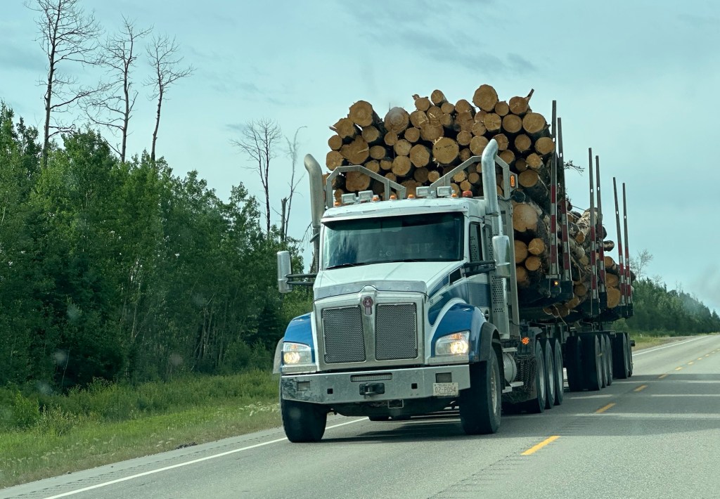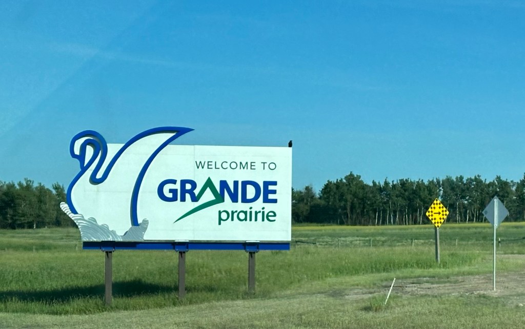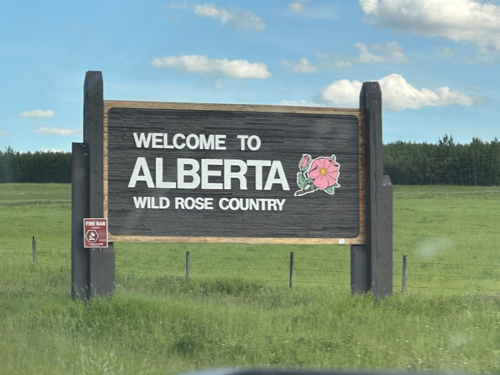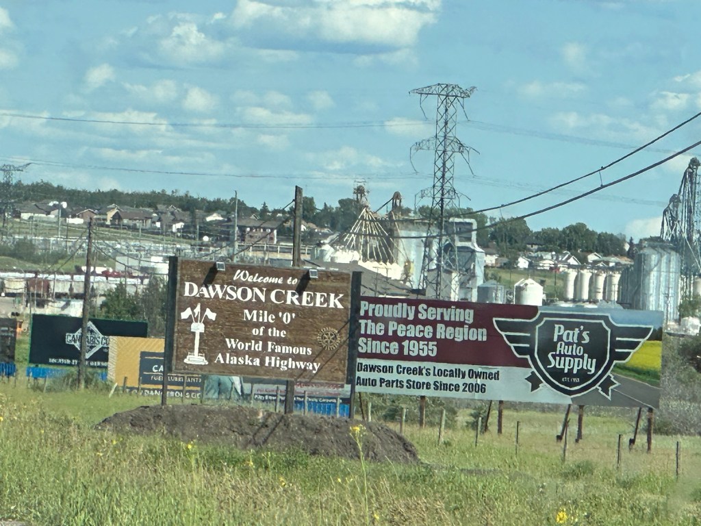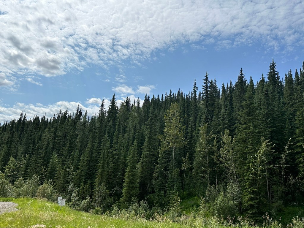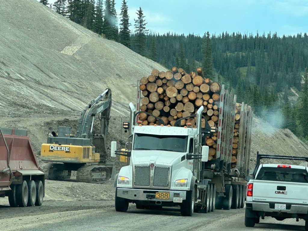 Today’s drive offered cloudy skies with streaks of sunshine. The paved roads continued to guide us through the prairie with the Rocky Mountains in the distance. We ran across lots of logging trucks, lumber yards and a coal plant.