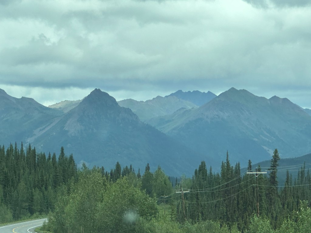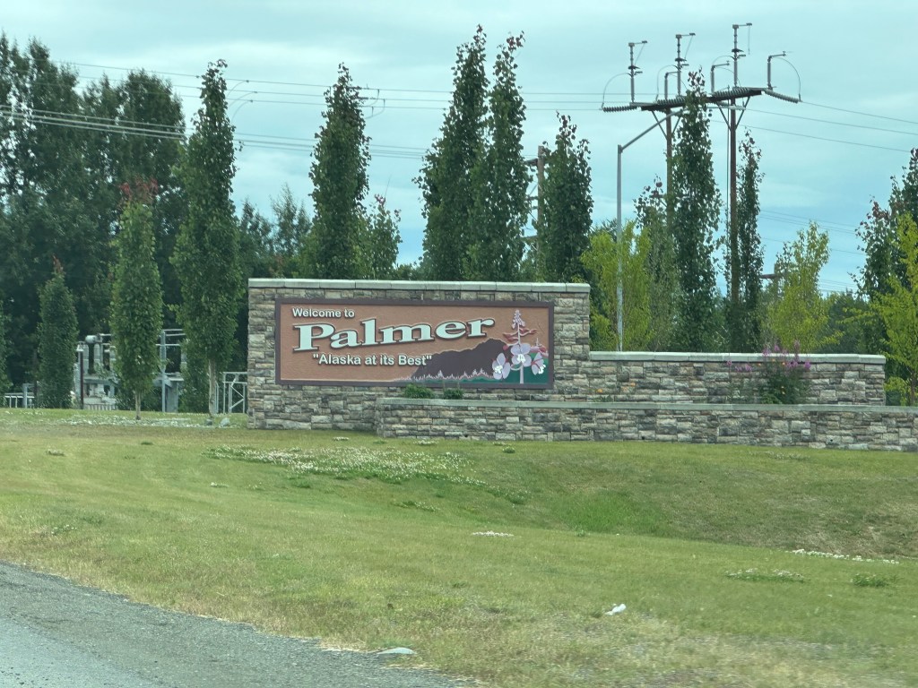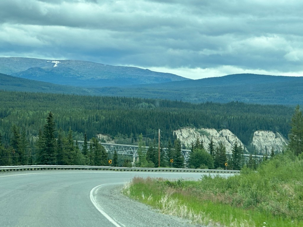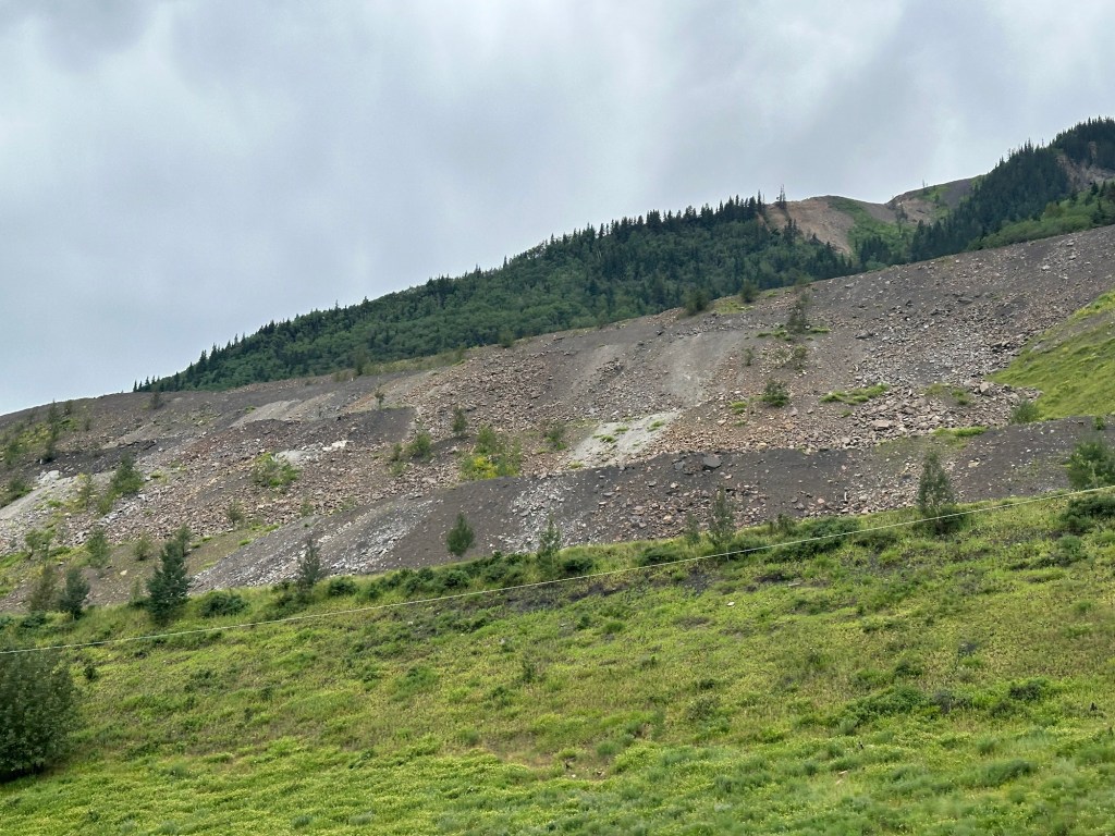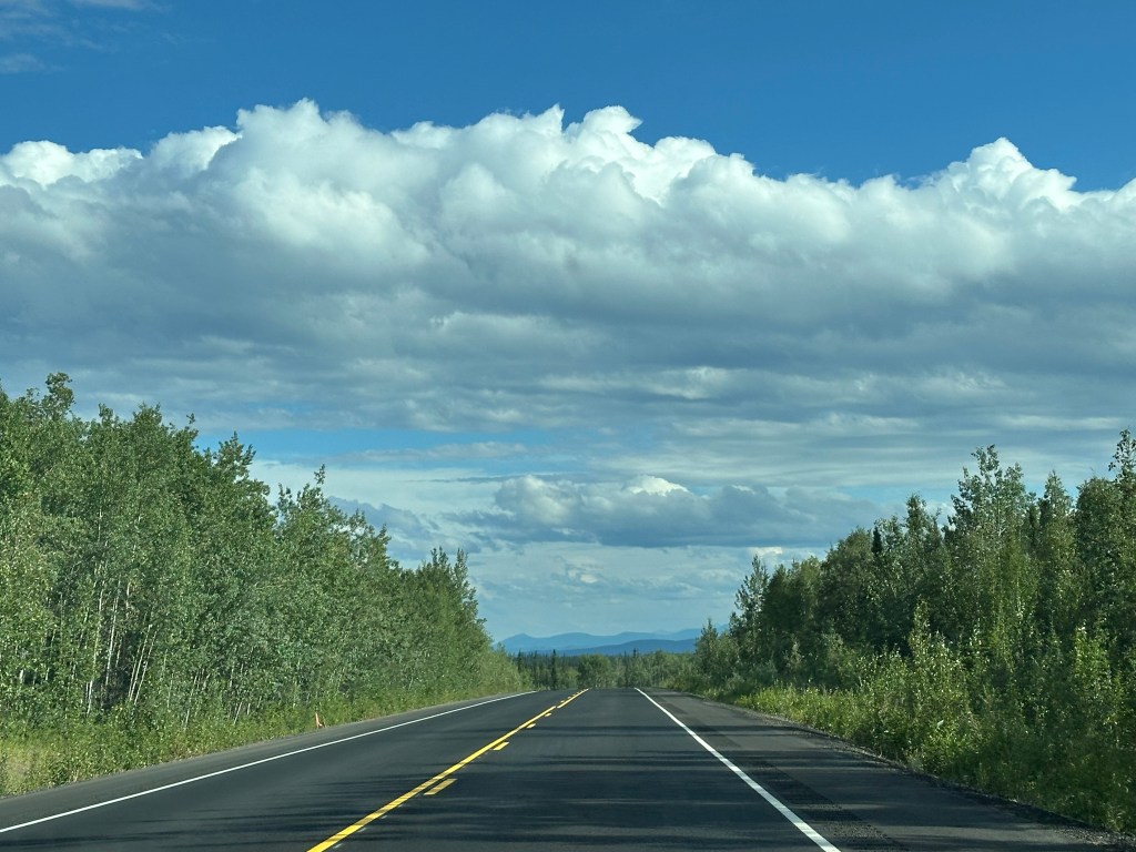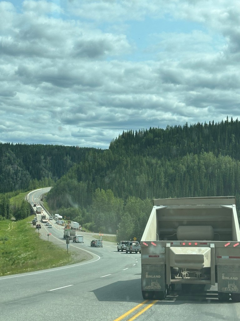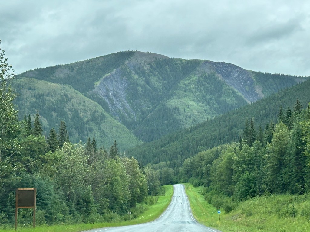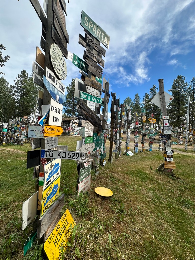 Today’s drive offered cloudy skies with streaks of sunshine. The paved roads continued to guide us through the prairie with the Rocky Mountains in the distance. We ran across lots of logging trucks, lumber yards and a coal plant.
