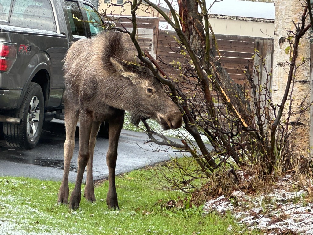 Our second surprise this morning was seeing a moose on the way to school. This little one seems to be a regular in our neighbor but s\he is always fascinating to watch.